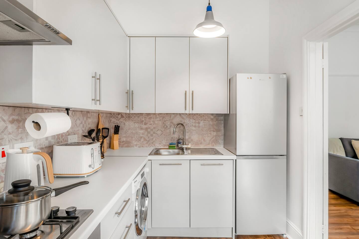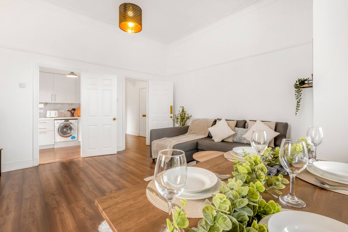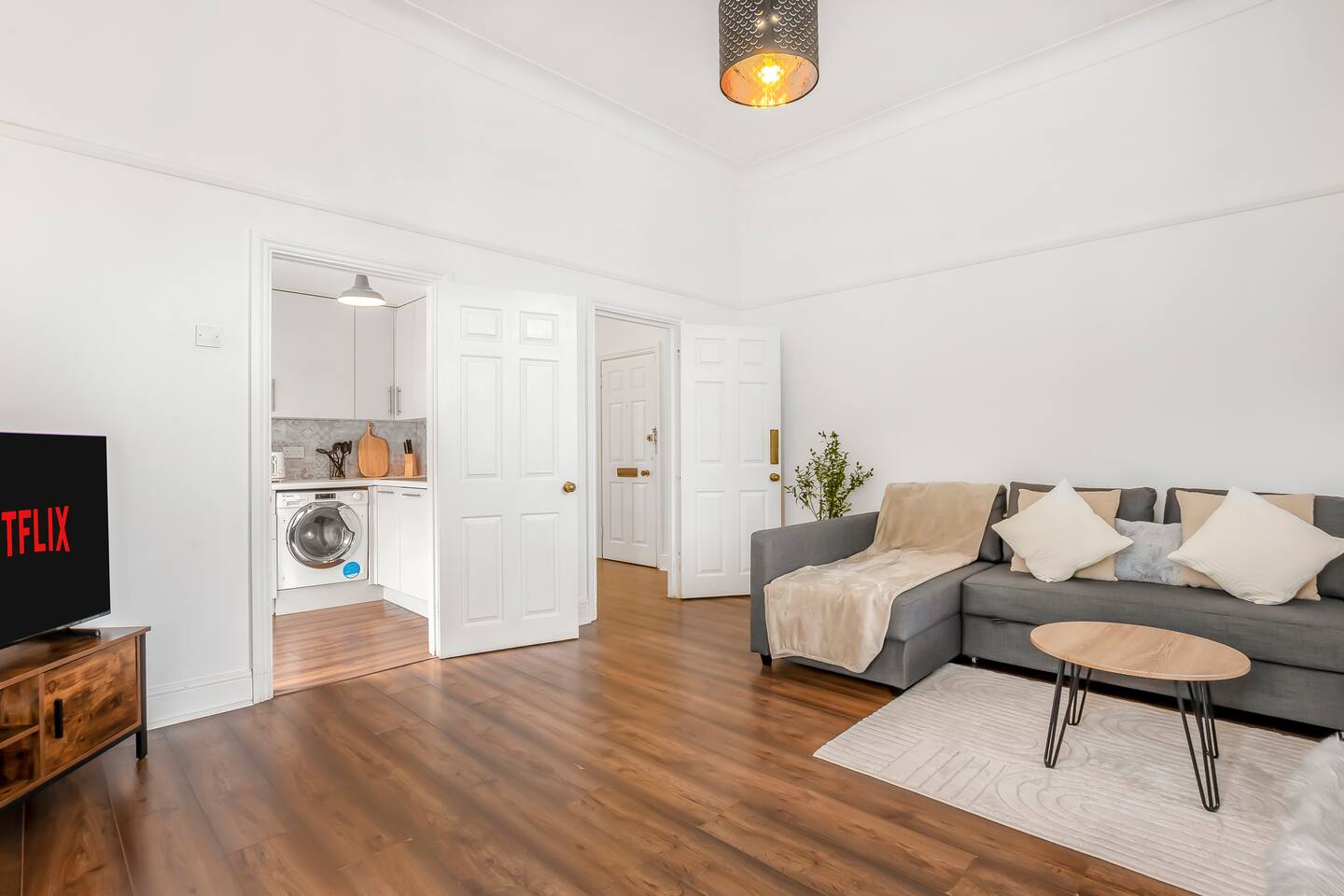 This modern 1-bedroom flat offers a bright and spacious living room with a large sofa bed, Smart TV with Freeview, Netflix, and a dining area by the window. The sleek kitchen is fully equipped with oven, hob, fridge-freezer, microwave, kettle, toaster, and washing machine. The cosy bedroom features a comfortable double bed, ample storage with wardrobe and drawers, and a desk space for working. The bathroom has both a bath and shower with fresh towels provided. Outside, enjoy a private terrace with seating. The flat also benefits from its own private entrance and free parking at the rear of the property.
