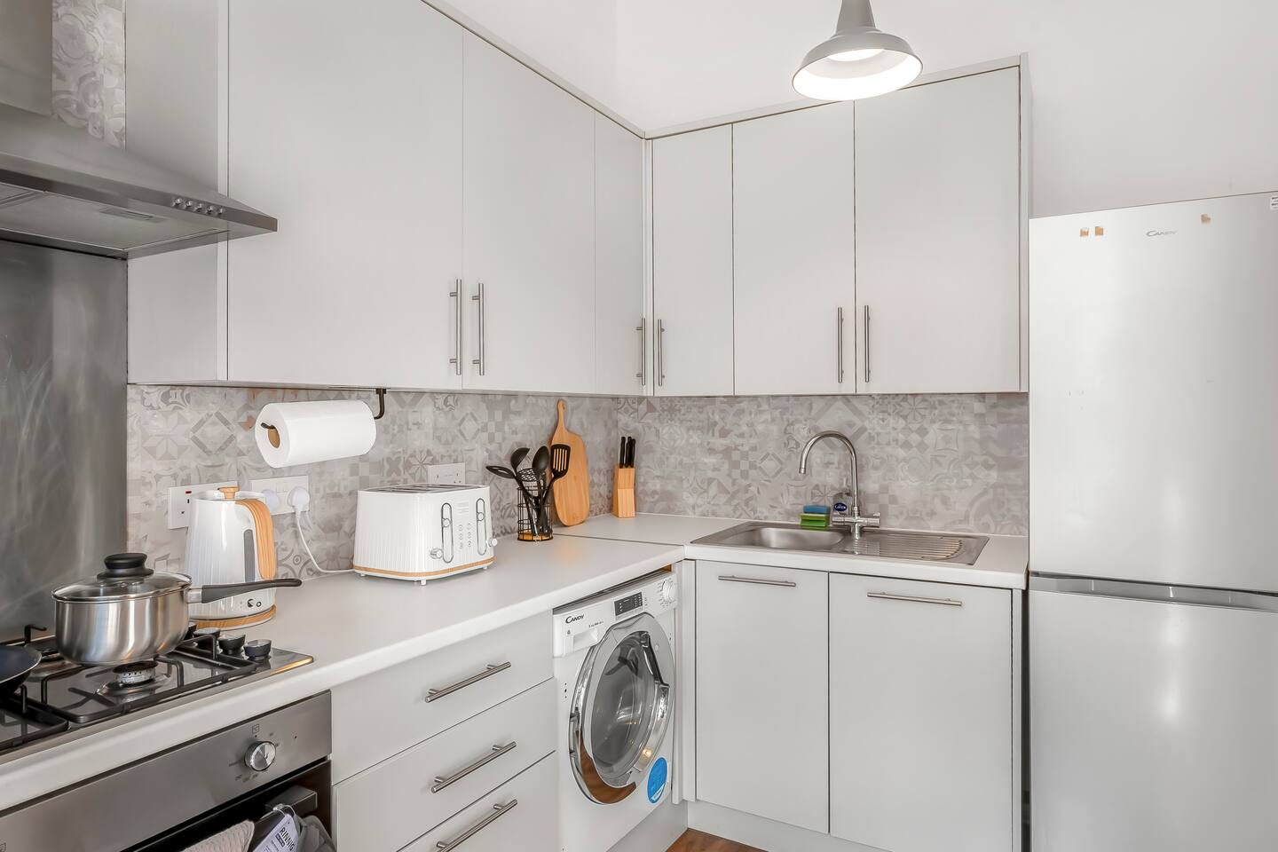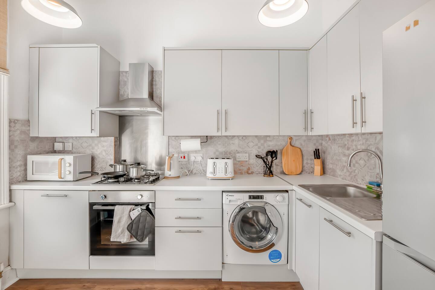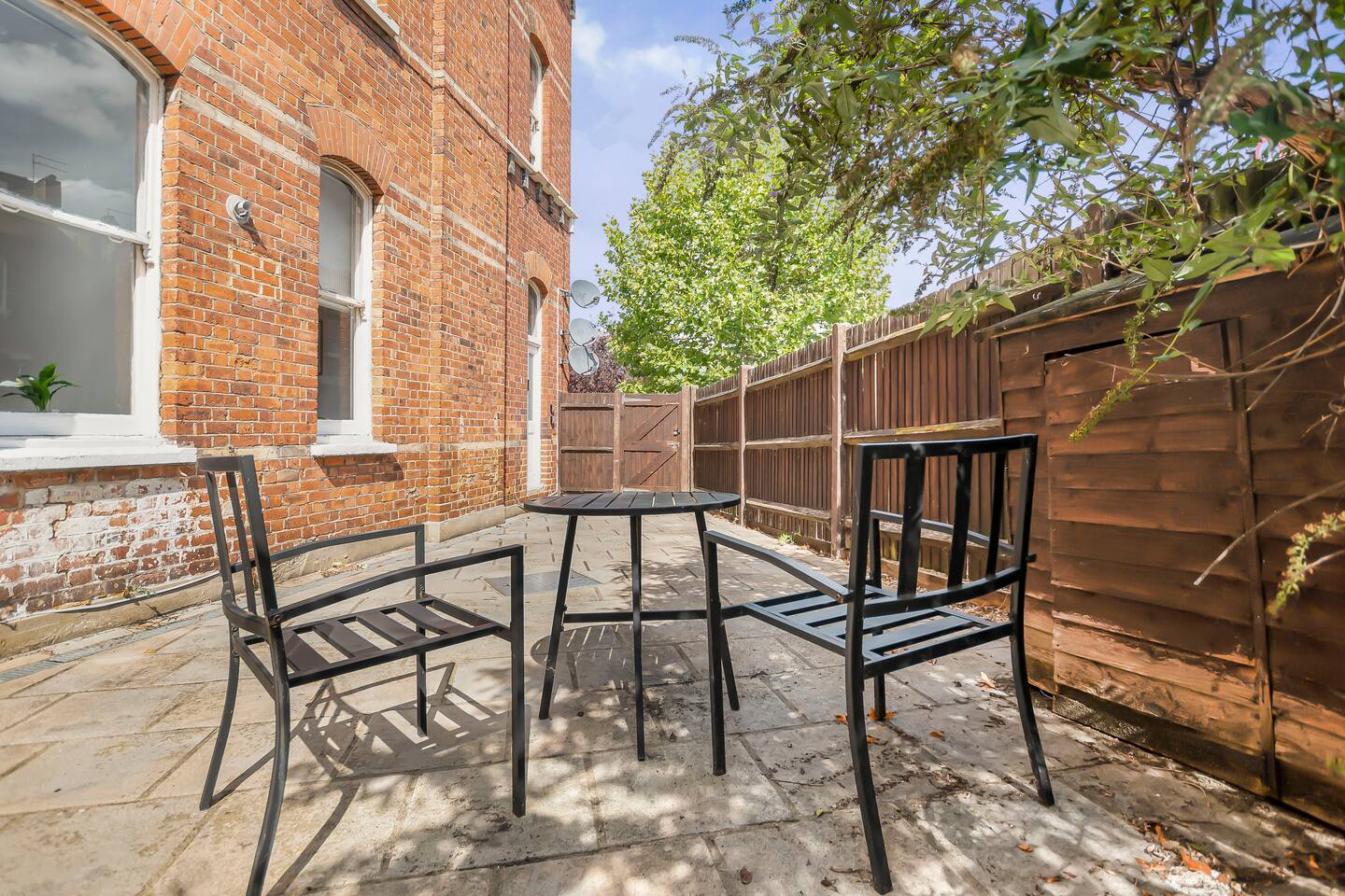 This modern 1-bedroom flat offers a bright and spacious living room with a large sofa bed, Smart TV with Freeview, Netflix, and a dining area by the window. The sleek kitchen is fully equipped with oven, hob, fridge-freezer, microwave, kettle, toaster, and washing machine. The cosy bedroom features a comfortable double bed, ample storage with wardrobe and drawers, and a desk space for working. The bathroom has both a bath and shower with fresh towels provided. Outside, enjoy a private terrace with seating. The flat also benefits from its own private entrance and free parking at the rear of the property.